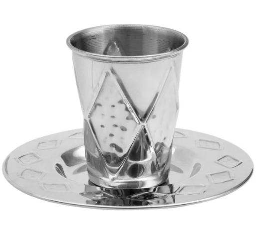 Copa con plato de acero inoxidable para Shabat y havdalah. Cumple con la exigencia halajica según la opinión del Rebiit Jazón ish. El  cual  establece un shiur (cantidad) de 5 onzas, 147 ml. Medidas: copa 7.5 cm. de alto y 6 cm. de diámetro, plato 13 cm. de diámetro.